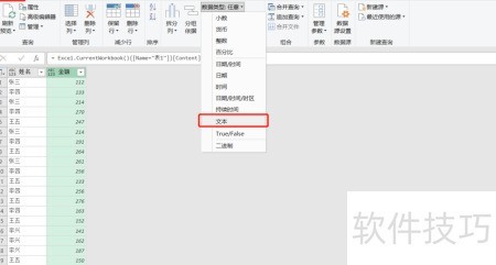 1、 选中指定区域,依次点击数据选项中的表格/区域,确认生成表格后进入Power Query编辑器,选择金额列,再通过主页中的数据类型将其更改为文本格式。