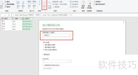 4、 选中自定义列后,在主页点击拆分列,选择按分隔符拆分即可。