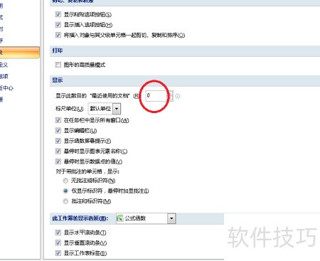 5、 在左侧选择高级设置,于右侧显示选项组中找到最近使用的文档数量调节框,将其数值设为0,点击确定完成设置。