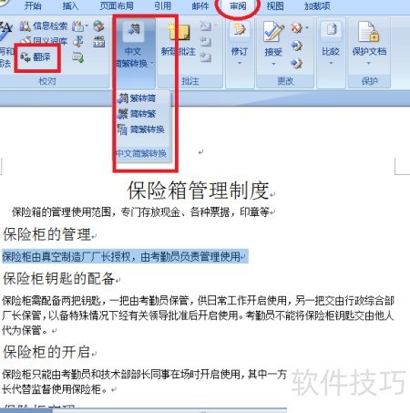 15、 在工具栏点击审阅,即可找到中文繁简转换与翻译功能,按需选择使用。