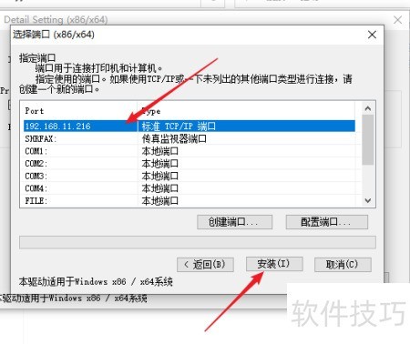 15、 返回选择端口界面,选中此前新建的端口192.168.11.216,然后点击安装按钮完成操作。