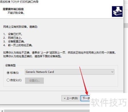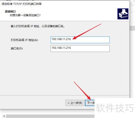 12、 在打印机或IP地址(A)栏中输入打印机当前的IP地址,例如192.168.11.216,然后点击下一步。若不清楚打印机IP地址,可查看相关操作指南获取帮助。