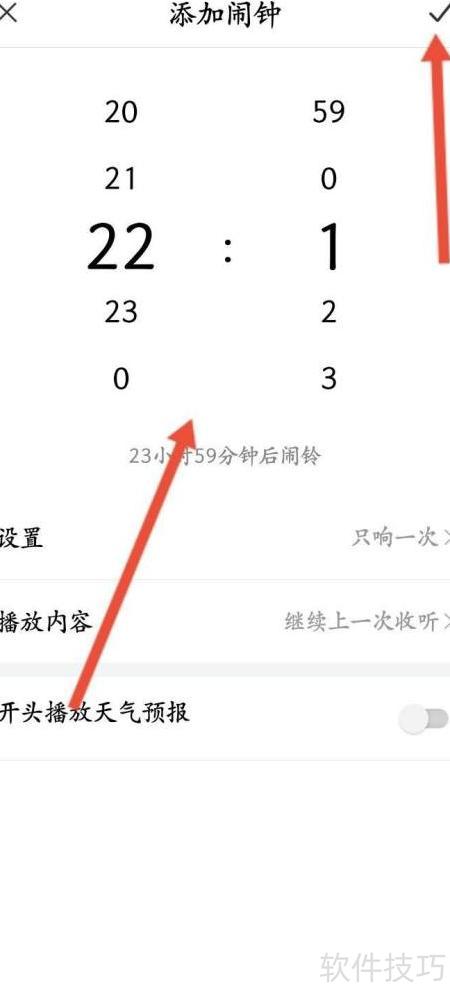 4、 进入界面后,设定闹钟时间,点击确认图标,即可成功添加闹钟提醒。