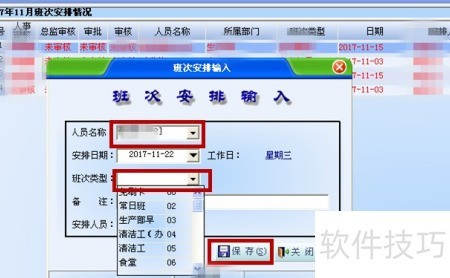 4、 进入班次管理后,右键点击弹出窗口,选择班次安排输入,按实际情况填写或选择姓名、日期及班次类型。完成后点击保存,可继续录入下一人。待上级审核前,信息显示为红色;审核通过后则变为蓝色。