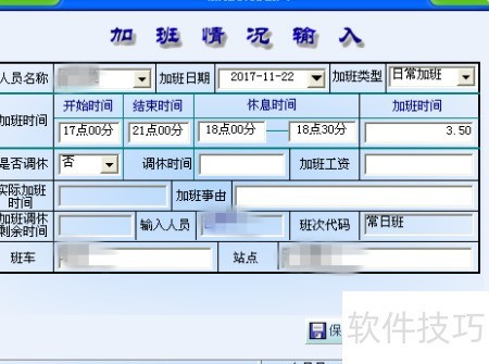 6、 进入主界面后选择加班管理,在新窗口中右键点击即可打开加班情况输入功能。依次填写加班人员姓名、日期时间及事由,保存后自动跳转至下一人录入界面。所有人员的加班信息将集中显示在列表中,待上级审核通过后,状态由红色转为绿色,并同步传送至人事考勤部门完成归档。