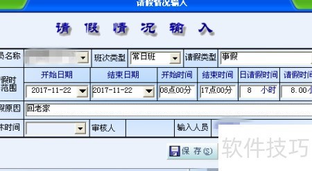 7、 在主界面选择请假管理,右键点击弹出选项,依次录入每位请假人员的信息,保存后自动进入下一人录入页面。审核流程与其他管理模块一致。