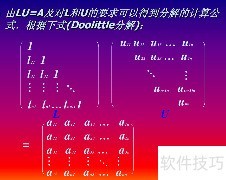 1、 将系数矩阵A分解为两个矩阵的乘积,其中一个为单位下三角矩阵L,另一个为上三角矩阵U。