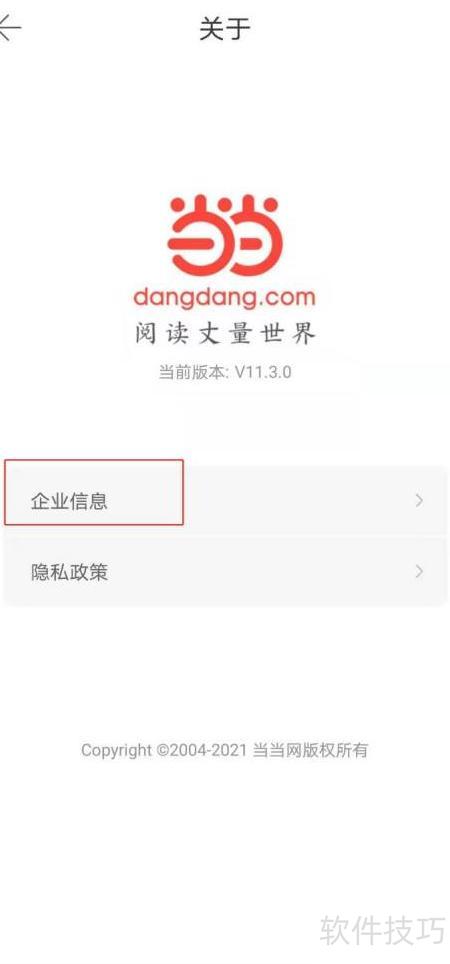 当当查看企业信息方法介绍 1、 打开当当网,进入个人中心。 2、 ,进入我的页面后点击设置图标。 3、 ,在设置中点击关于当当即可。 4、 进入关于页面后选择企业信息选项 5、 操作,可查企业信息。 ...