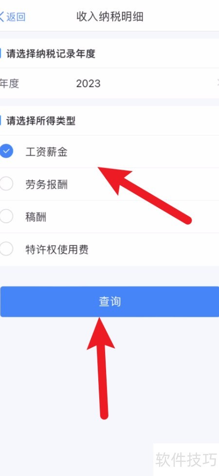 2、 选择年份,勾选工资薪金项目后点击查询即可。