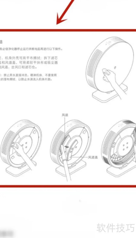 4、 第四步:按提示拆下仓盖,用半干湿布擦拭风道、出风口及滤芯仓,切勿用水冲洗。
