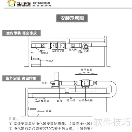 22、 净化器必须水平安装,严禁垂直放置,以免油滴回流进入风管或风机。