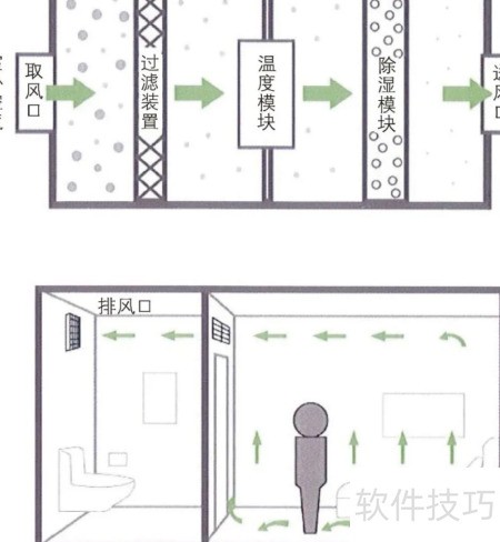 3、 全新置换新风系统通过高效过滤、除湿与加湿处理,将洁净健康的空气持续由客厅及卧室地面送风口输入,沿地面扩散形成新风湖。室内污浊空气被新风带动上升,从顶部排风口排出,实现地送顶回的气流组织,有效提升空气质量,营造清新舒适的室内呼吸环境。