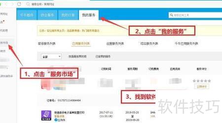1、 进入阿里店铺后台,依次点击我的阿里、应用工具、服务市场,搜索并订购快递助手电子面单批量打印软件。