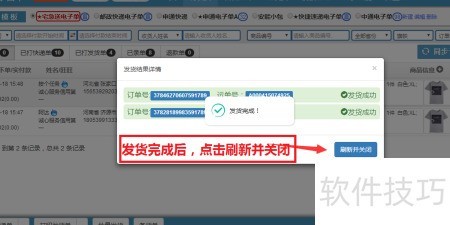 4、 打印完毕后系统提示发货,点击即可后台自动完成发货流程。