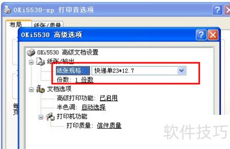 4、 添加新纸张后,需在打印机属性中设置:右键点击打印机,进入打印首选项的高级选项,将纸张规格选为新建的快递单类型,并保存配置。