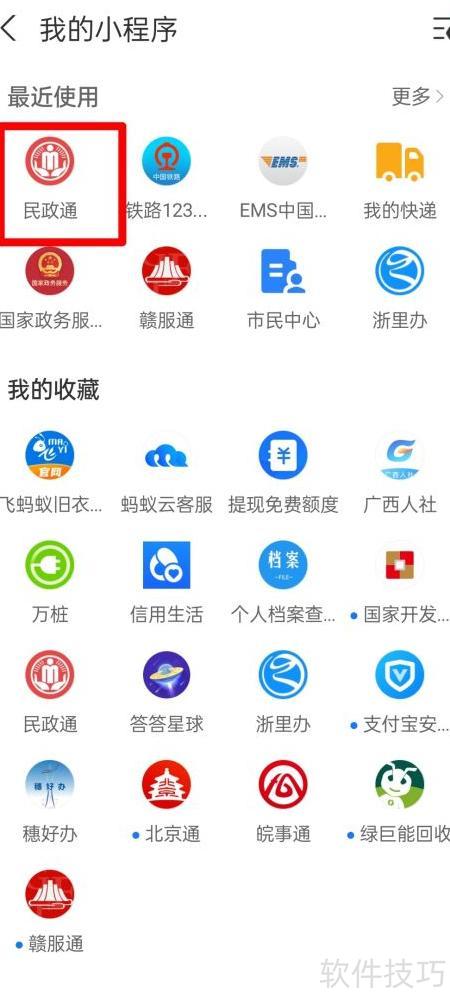 1、 打开支付宝,搜索并进入民政通小程序服务。