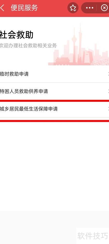 3、 进入社会救助页面,选择城乡居民最低生活保障申请,按要求提交材料即可办理。