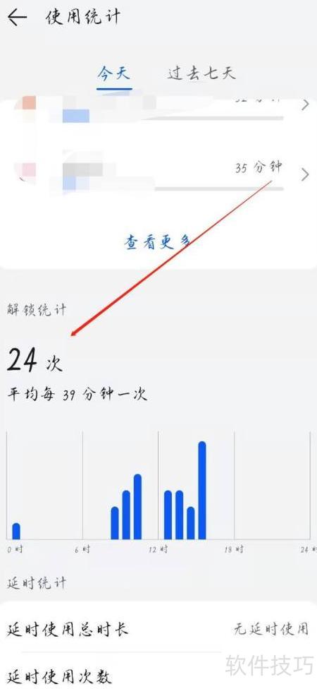 6、 向下滑动至解锁统计,查看今日手机使用次数。
