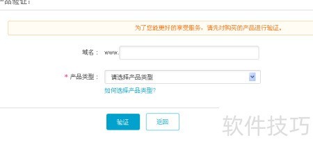 4、 进入产品验证页面后,需提交域名并选择备案空间的类型以完成操作。