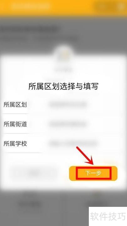 7、 选择所在区划与街道,输入学校名称后点击下一步。