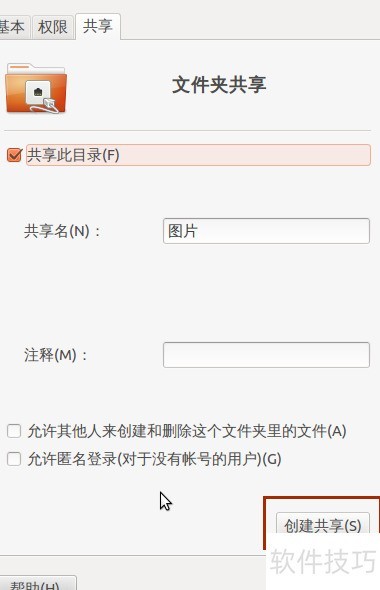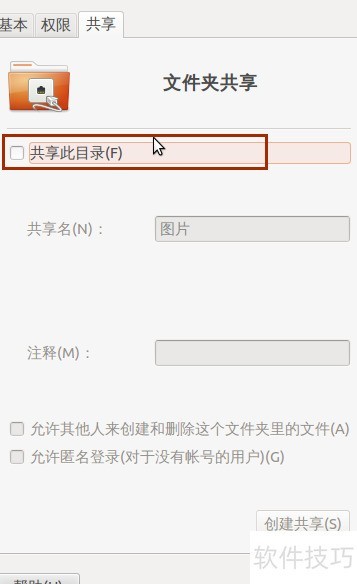 7、 安装应用后点击创建共享,即可完成Ubuntu文件夹的共享设置。