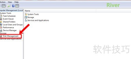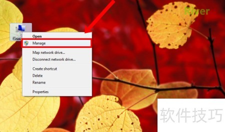 1、 进入Win7桌面后,右键点击计算机,选择管理,打开计算机管理窗口。