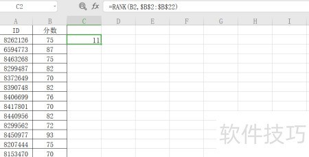 7、 当B2单元格的分数为75时,其在全部分数中排名第11位。