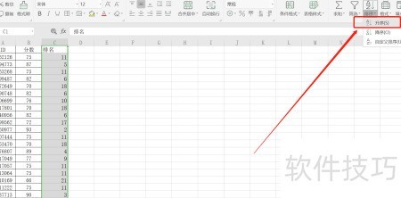 10、 选中C列,点击中的,选择升序并扩展选定区域完成排序。