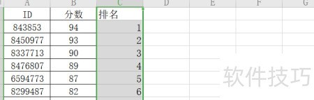 8、 选中C2单元格右下角,按住鼠标左键向下拖动,即可填充其他分数的排名。