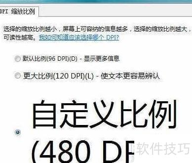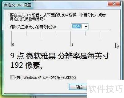 4、 在右下角选择自定义DPI,可调节字体大小范围为100%至500%(相当于480DPI)。当使用19英寸1440×900分辨率的宽屏LCD时,若雅黑字体放大超过150%,防锯齿效果将消失。调整设置后,系统会在DPI缩放对话框中显示自定义DPI选项,并依据先前设定的数值自动更新显示比例,确保界面适配清晰。