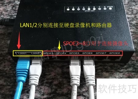 6、 将交换机与路由器连接并确保路由器可访问外网后,用网线将SPOE交换机的LAN1口与硬盘录像机的网络接口相连。