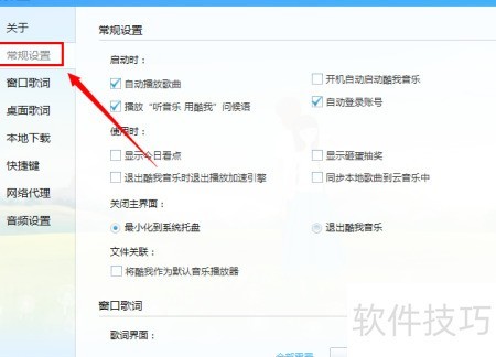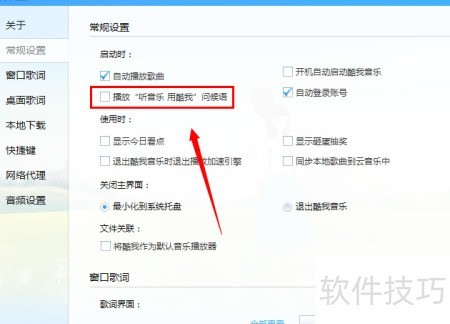 5、 在常规设置中找到播放听音乐用酷我问候语选项,取消勾选即可。