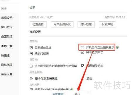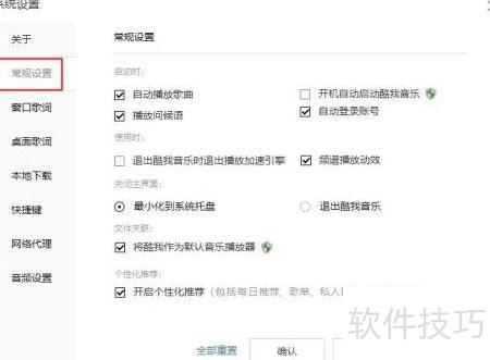 3、 进入常规设置,开启开机自动启动酷我音乐选项,最后点击确认完成设置。