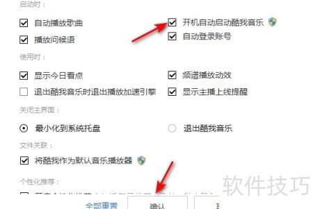 5、 取消勾选开机自动启动酷我音乐,点击应用并确认...
