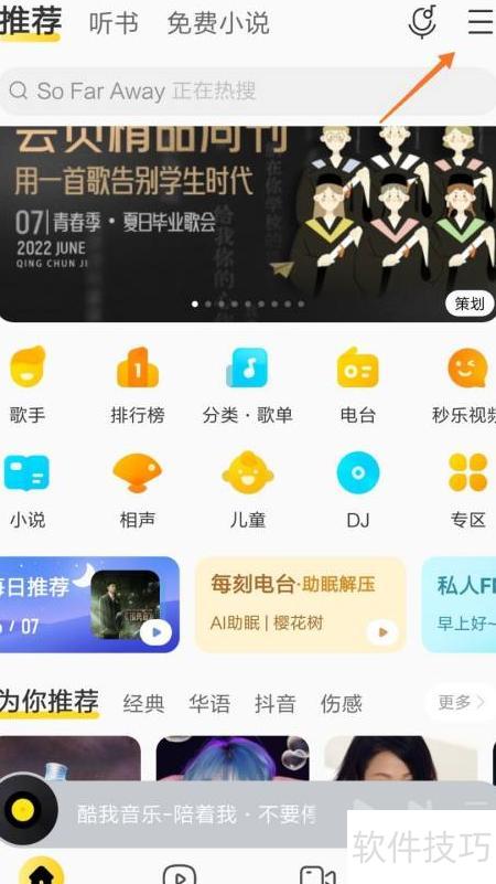 1、 启动酷我音乐,点击顶部三条横线图标。