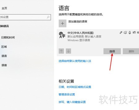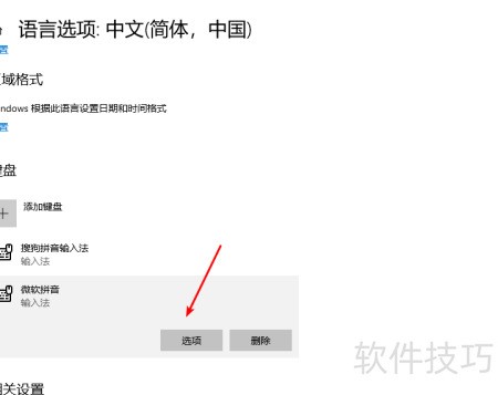 3、 进入语言设置后,下滑至微软拼音并点击其下方的选项按钮。