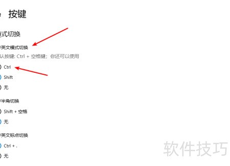 5、 返回微软拼音设置,进入按键选项,将Shift键功能更改为Ctrl键。