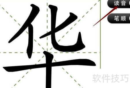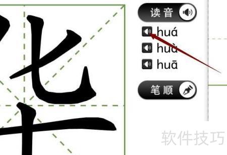 6、 选中华字后,系统自动显示为印刷字体;双击可放大突出显示,点击读音按钮即可播放发音。