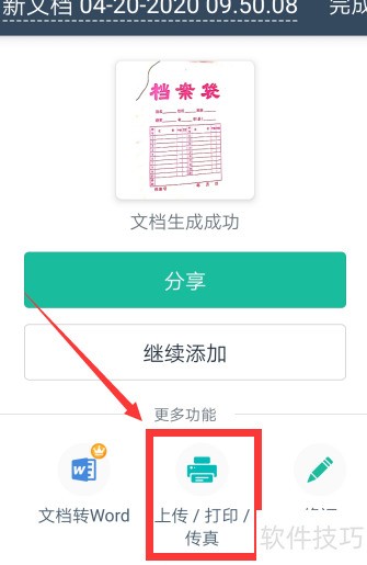 5、 生成扫描件后,请点击下方上传/打印/传真按钮进行操作。