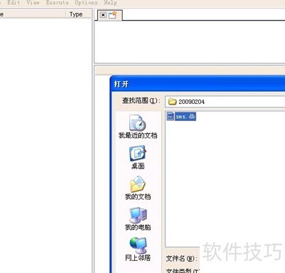 5、 在文件菜单中选择打开数据库,浏览并选中之前复制的sms.db文件,确认后即可成功加载该数据库。