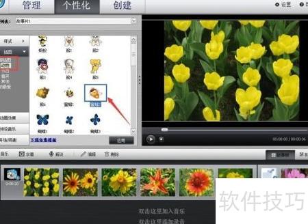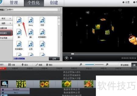 6、 选择预设音乐:素材为简短配音,需添加喜爱的音乐。在时间线下方双击插入,并调整音乐时长以匹配时间线。