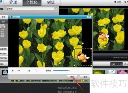 4、 挑选喜爱的插图,如动物、节日或搞笑类,双击进入编辑界面,调节其位置、大小与透明度后确认,最终效果所示。