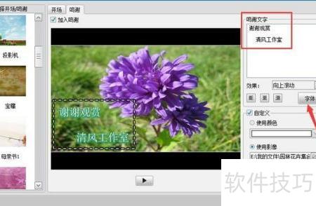 8、 进入设计界面后,先制作开场画面与文字特效,可选择添加或跳过开场及鸣谢部分,最后完成鸣谢结束语的设计,整体效果参考示意图。