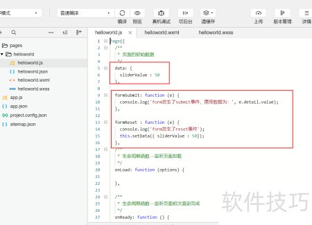 3、 在JS文件中初始化滑块组件绑定的变量值,并定义表单组件的两个事件回调函数,分别用于处理提交和重置操作时的逻辑。
