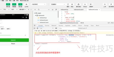 5、 编译保存后,在模拟器中预览界面,依次点击提交与重置按钮,查看调试输出信息,结果与预期一致。