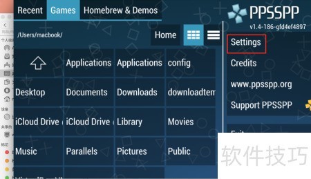 9、 此时打开ppsspp默认为英文界面,只需点击设置选项即可更改语言。