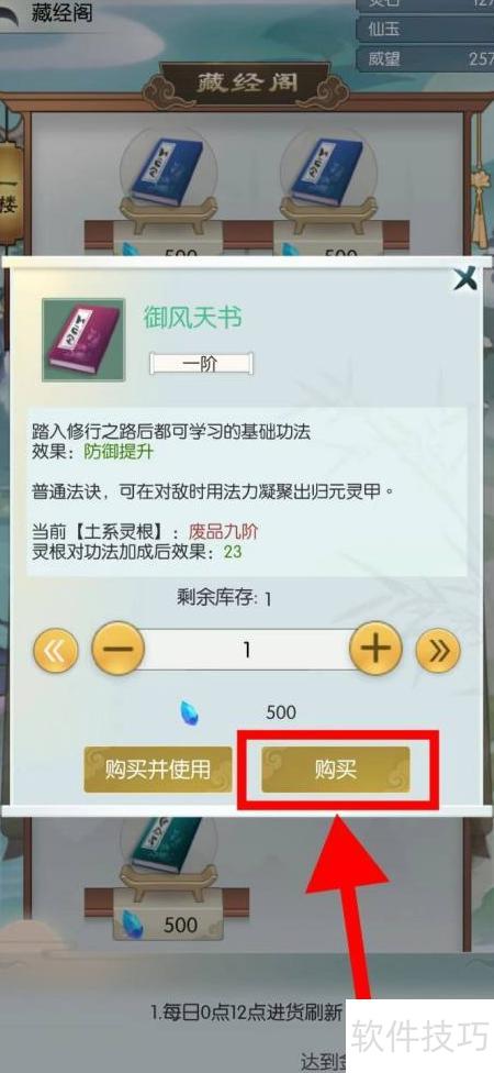 3、 进入御风天书界面,点击购买图标即可完成操作。