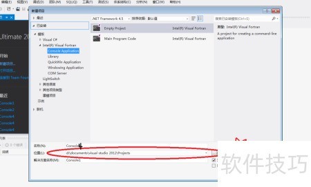 3、 选择模板/Intel(R) Visual Fortran/控制台应用程序,中1所示;接着在右侧选项中勾选空项目,对应图中2的位置;设置完成后,点击确定按钮,即图中3所指位置。操作完毕后,项目即可创建成功。图中五角星标记处显示了当前项目的名称为Console4,同时指示该工程文件Console4的具体存储路径。