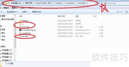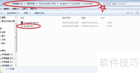 5、 请将需运行的for文件置于默认路径D/我的文档/Visual Studio 2012/Projects/Console4/Console4/中,该位置已在图示以五角星标出,确保程序正确读取和执行文件内容。