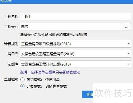 1、 创建项目,输入名称、规则及定额清单库信息。
